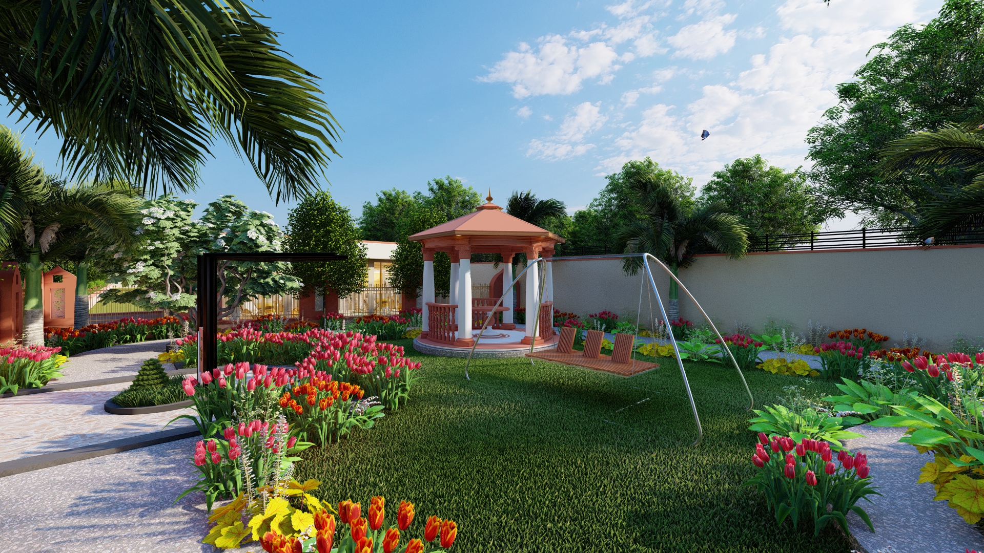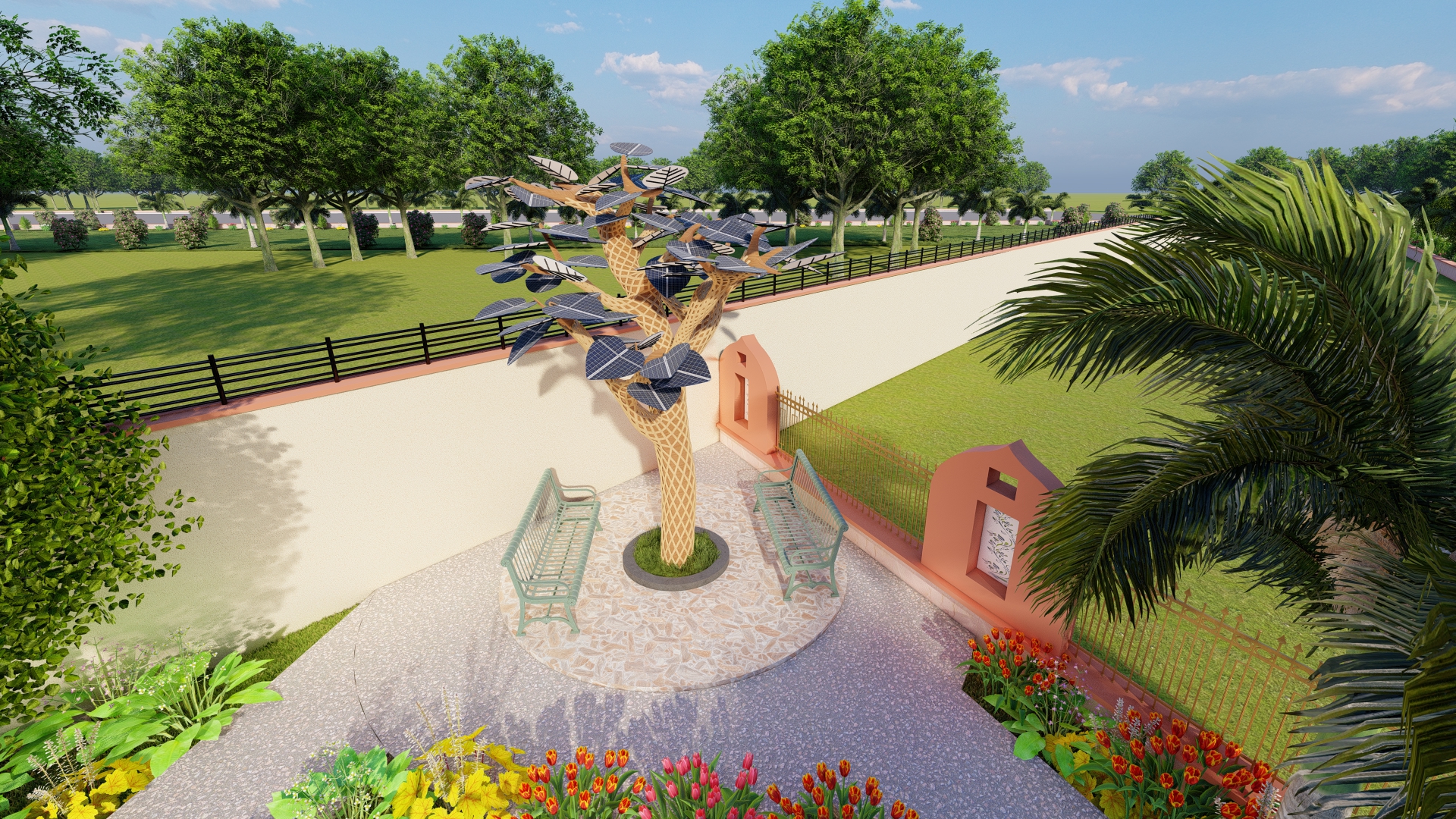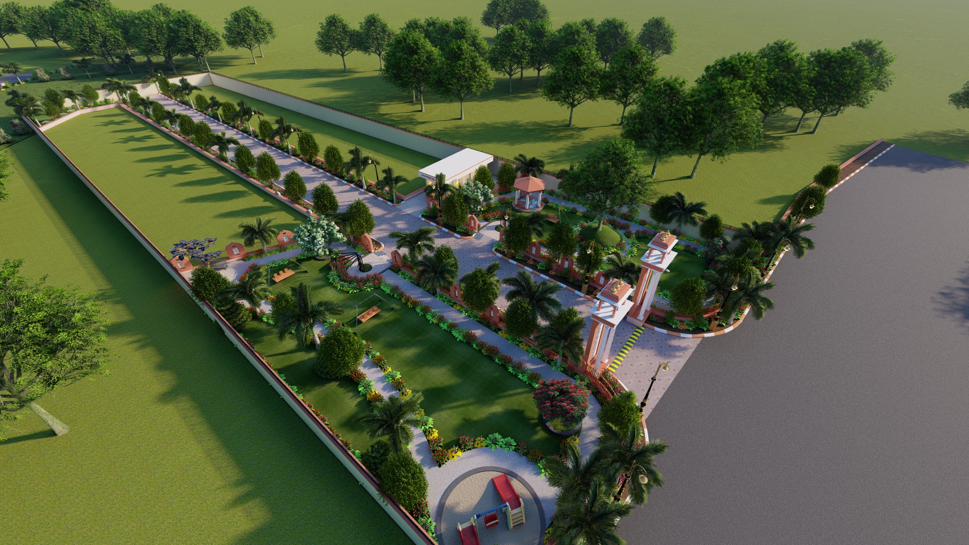 Designed to provide a serene and natural environment, the project features lush gardens, tree-lined roads, and dedicated green spaces for a refreshing lifestyle. A beautifully designed gazebo offers a tranquil space for relaxation, while a dedicated kids' play area with swings ensures a fun and nurturing environment for children. To promote sustainability, solar trees have been installed to supplement electricity needs. Every feature of this project has been thoughtfully integrated to enhance the quality of life for residents.